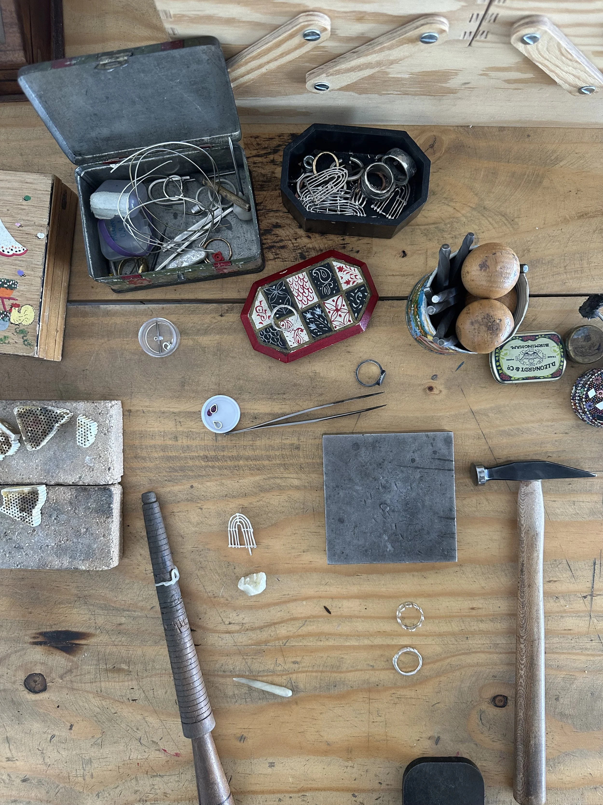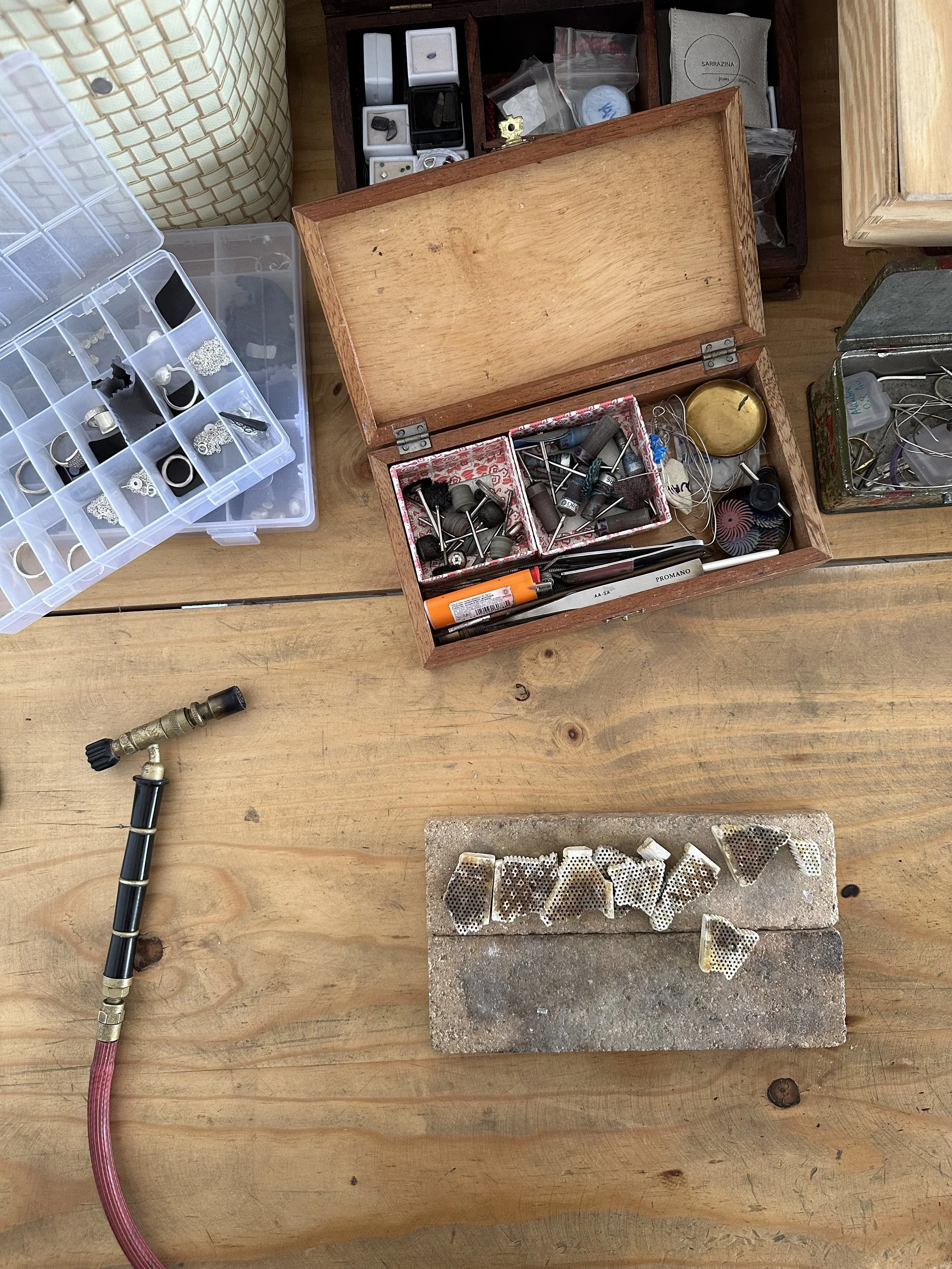 En su mesa, a un lado del living comedor, tiene varias cajitas, materiales, un soplete. Nos explica que tiene que mantener todo bien guardado y ordenado por su hijo, quien siente curiosidad por las herramientas que tiene, y que por eso le puso una mesita similar con elementos de madera para que tenga su propio espacio de trabajo. Abriendo cajitas, saca distintos objetos, entre ellos una bolita de cera de abeja que amasa con la mano. Nos explica que es uno de los materiales que más le gusta trabajar. Al rotarla entre los dedos y la palma, se va calentando y cediendo su forma. “Sentir que el material se transforma porque está en contacto contigo y tú lo estás amasando. La proximidad es algo que he ido entendiendo que es muy importante para mí, sea para un anillo que voy a vender o una pieza que simplemente necesito sacar de mí, que va a existir”.